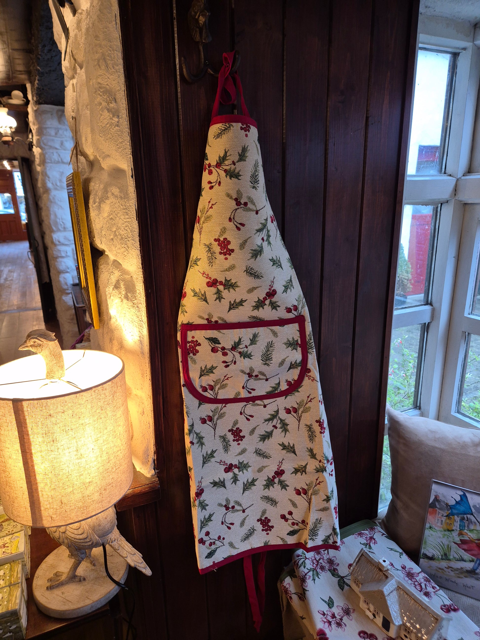 Crafted from a woven jacquard fabric, this apron features a Christmas Holly sparkle design with a red trim. This festive apron will keep you clean and in the festive spirit.