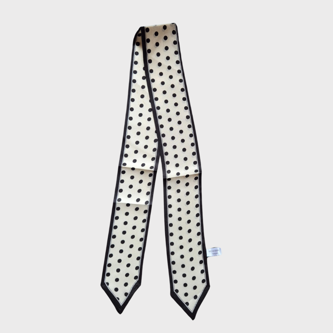 Elevate your style with this Mulberry Silk Polka Dot Neck Tie, crafted from 100% luxurious Mulberry silk for a soft, smooth touch. The classic black and cream polka dot design adds a timeless charm, perfect for enhancing any outfit with subtle elegance. Comfortable to wear all day, this neck scarf offers a gentle drape that complements your look while providing a refined finishing touch.